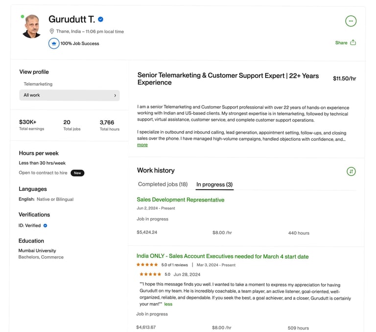 I am a senior telemarketing and sales professional with over 22 years of hands-on experience working with US and Australia–based businesses. My core strength is telemarketing, supported by lead generation, appointment setting, sales closing, customer support, and CRM management.